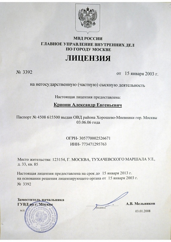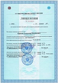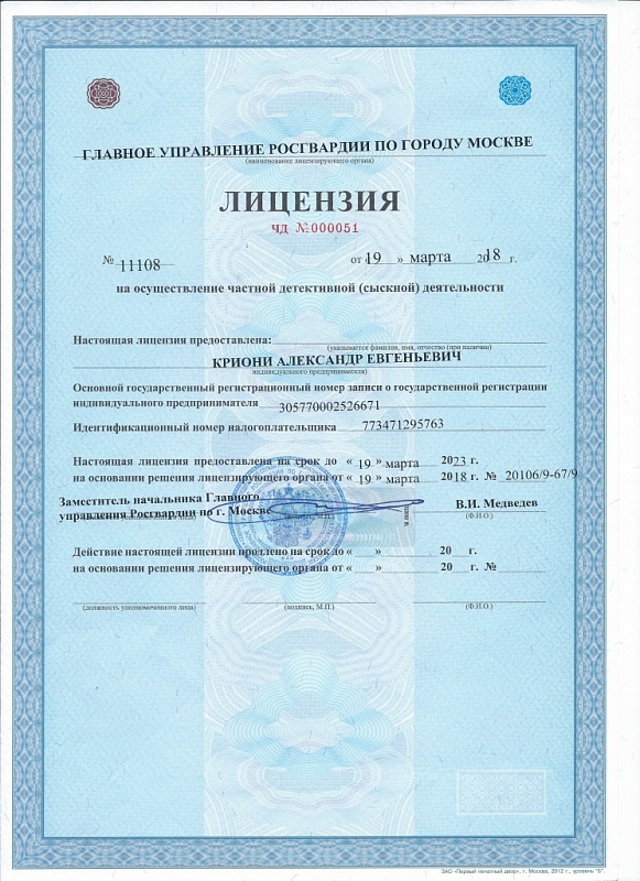 Compliance certificate on the major “Patent Law Objects Research”; Private detective license; Certificate on making entry into EGRIP (Unified State Register of Individual Entrepreneurs); INN (Taxpayer Identification Number) certificate[...]